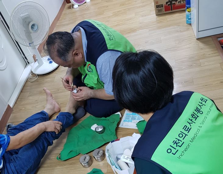 의료진 4명, 간호팀 2명, 일반봉사자 4명 등 총 12명으로 구성된 인천의료봉사단은 지난 4월에 이어 2번째 봉사로 신현․석남동과 연희․가정동 2개조로 나눠 총 8세대를 방문했다.
