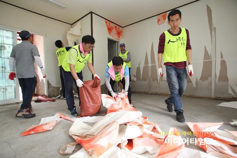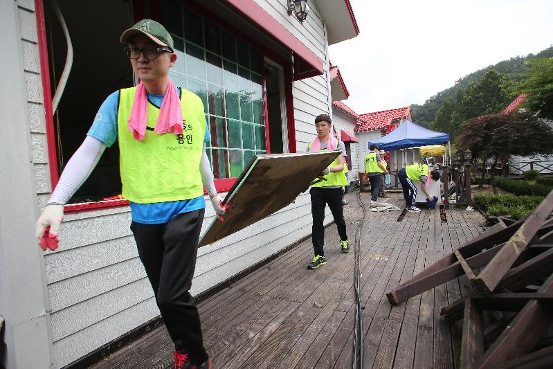 이날 직원들은 물에 잠겼던 펜션 내부의 벽지와 쓰레기를 제거하고 부서진 구조물과 설비를 수리하는 등 복구작업을 도왔다.