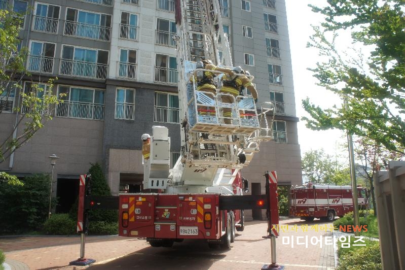 이 날 훈련은 소방대원들의 현장적응능력을 배양하기 위해 맞춤형 현장대응 매뉴얼에 의해 출동대별 임무 ▲준초고층 건축물 전담소방대 임무별 활동사항 숙지 ▲자위소방대 초기 화재진압(공기안전매트 전개훈련 병행)▲굴뚝효과를 감안한 거주자 긴급대피 훈련 ▲굴절차 등 특수차 활용 화재진압, 인명구조훈련 등으로 실시됐다.