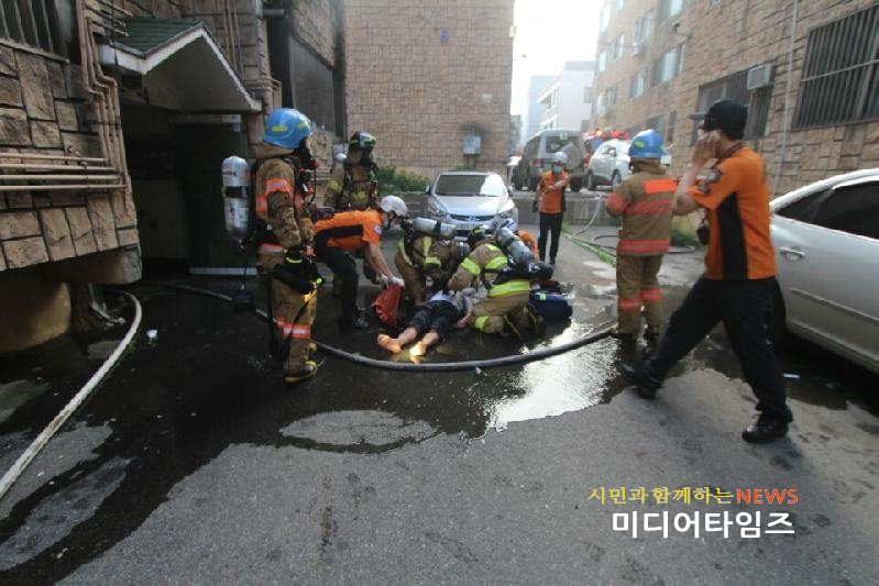 | 인천서부소방서 가정동 삼우타운 화재 신속한 인명구조 모습.<ⓒ미디어타임즈> |