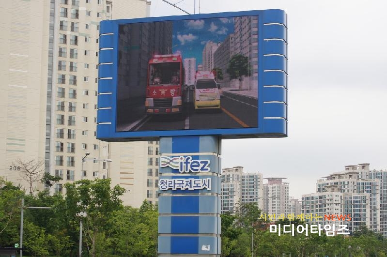 | 인천서부소방서, 청라국제대로 대형전광판‘모세의 기적’길 터주기 홍보 사진.<ⓒ미디어타임즈> |