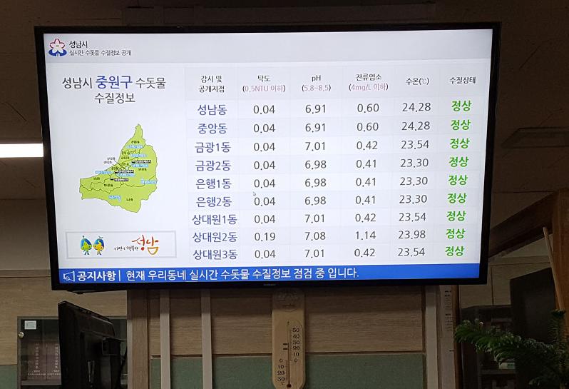 성남시는 우리 동네 수질 정보를 시청 1층 종합민원실과 수정·중원·분당구청 시민봉사과에 설치한 LED 모니터를 통해서도 송출한다.
