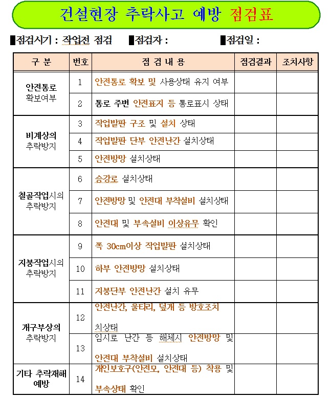 감독시 중점 점검사항은 작업발판, 안전난간, 개구부 덮개, 추락방망 설치 여부 등의 추락재해예방 안전조치에 대한 사항으로 감독결과, 안전조치 소홀로 적발될 경우 작업중지․안전진단명령은 물론 사법처리 등 엄정 조치한다.