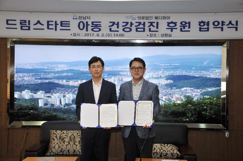 성남시는 8월 2일 오후 2시 시청 상황실에서 김진흥 부시장, 장영준 의료법인 메디피아 이사장 등이 참석한 가운데 ‘드림스타트 아동 건강검진 후원에 관한 협약’을 했다. 올해로 5년째다.