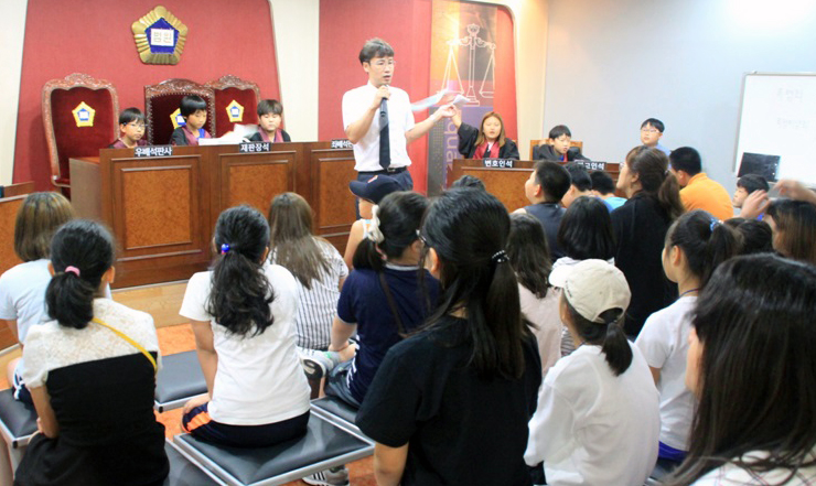 | 지난달 17일 여수시 드림스타트 아동들이 대한법률구조공단 법문화교육센터에서 모의재판 체험을 하고 있다. |