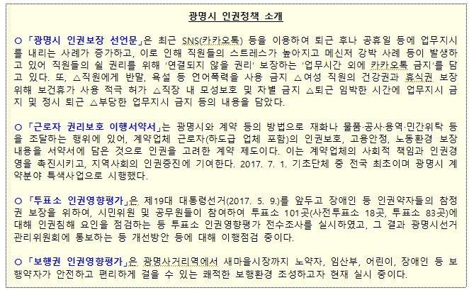 구체적인 안이 나온 것은 아니지만 근로자 휴식권을 보장하는 정책을 수립하며 광명시의 직원 인권보장 선언을 참고한 것으로 알려졌다.