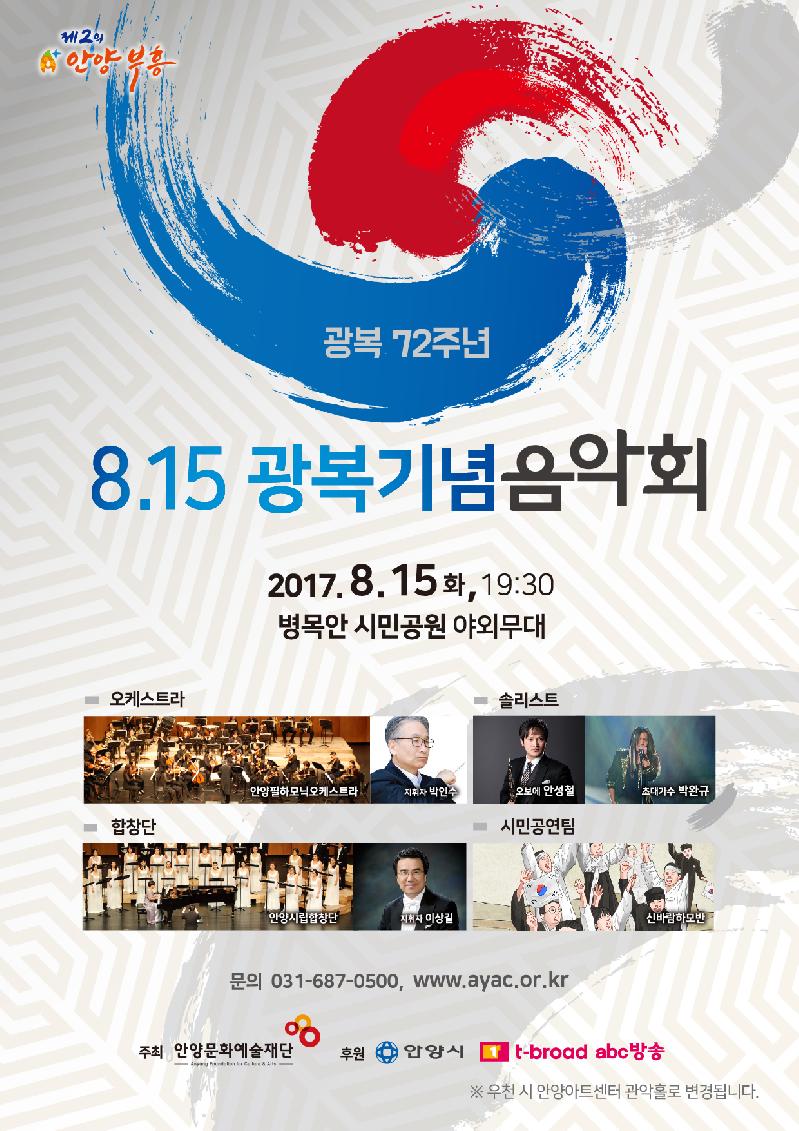 이필운 안양시장은“광복 72주년을 맞아 가족이 함께할 수 있는 음악회를 통해 여름밤의 정취를 시민들에게 선사하고 싶다”고 말하며, “이번 공연이 광복의 의미를 되새기고 미래의 희망을 이야기하는 화합의 자리가 되기를 바란다”고 덧붙였다.