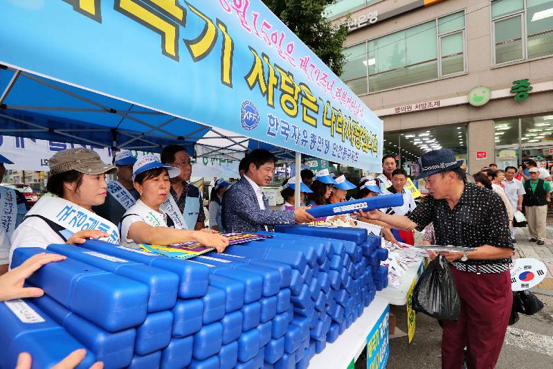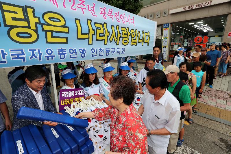 [미디어타임즈=문상수 기자] 한국 자유총연맹 동구지회는 10일, 송림로터리 일원에서 광복 72주년 맞이 나라사랑 태극기 달기 운동을 개최했다.이날 행사는 주민들에게 자발적인 광복절 태극기 달기 참여 분위기를 조성하고, 나라사랑 일체감을 조성하는 민주시민의식을 고양시키고자 마련됐다.자유총연맹 회원 30여 명과 이흥수 동구청장이 이날 태극기 달기 운동에 참여했으며, 태극기 게양 홍보부채와 차량 및 가정용 태극기를 주민들에게 배부하며 태극기에 담긴 뜻과 게양 방법을 널리 홍보했다.이날 행사에 참석한 이흥수 동구청장은 “광복 72주년을 맞아 태극기 달기 캠페인에 참여하게 돼 영광스럽다”며 “대한민국 국민으로서의 순국선열과 애국지사에 대한 숭고한 나라사랑 정신을 기리기 위해, 태극기 달기 운동에 주민여러분들이 많이 동참해 주시기 바란다”고 말했다.한편 자유총연맹 동구지회는 안보교육, 전방지역 견학, 어머니 포순이 활동, 자율방범활동, 태극기 달기 행사, 전쟁음식 체험 행사 등 지역사회를 위한 다양한 사업을 전개해 나가고 있다.