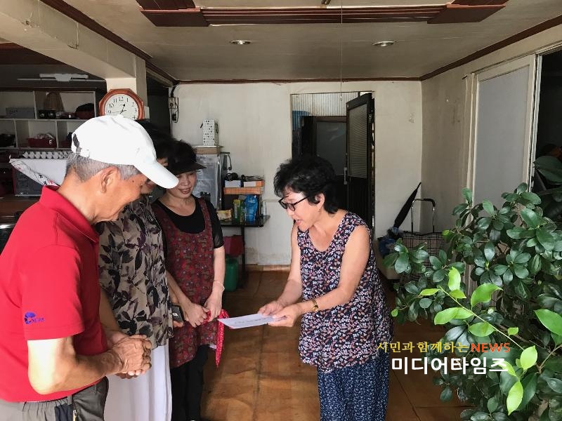 [미디어타임즈=문상수 기자] 지난달 23일 내린 집중호우로 부평구(구청장 홍미영)에 많은 침수 피해가 발생한 가운데, 산곡1동 지역사회보장협의체가 최근 산곡1동 관내 저소득 호우피해가구에게 일시금(위로금)을 지원했다.산곡1동지역사회보장협의체(위원장 이종오)는 집중호우로 시름에 잠겨있는 주민들을 위로하고, 복구부담을 덜어주고자 수급자, 차상위 및 주거취약계층 등 총 7세대에게 각각 10만원 씩 일시금을 지원, ‘이웃이 이웃을 돌보는 사회안전망’을 구축하는데 기여했다.이번 호우로 집안 가재도구가 침수돼 어려움을 겪던 전모 어르신은 “일시금 지급으로 많은 위로가 된다”며 감사를 표했다.산곡1동 지역사회보장협의체는 지난 2월부터 기금을 활용, 월 1회씩 저소득 어르신을 위한 반찬 나눔을 통해 이웃 사랑을 실천하고 있다.
