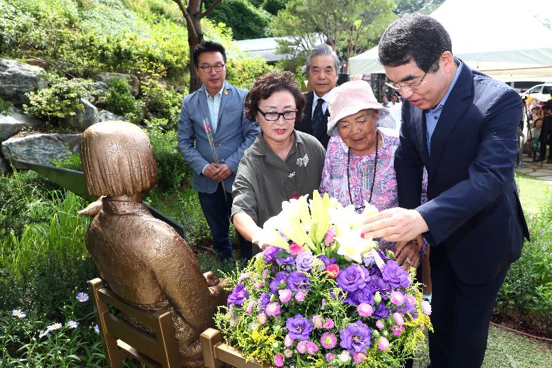 이날 행사에 참석한 위안부 피해자 이옥선 할머니는 “소녀상 옆의 예쁜 꽃들을 보니 옛날 생각도 나고 감회가 새롭다”며 “일제시대의 피해에 대해서 일본 정부가 하루빨리 사과하고 적정한 배상을 해야 역사가 바로 설 것”이라고 강조했다.