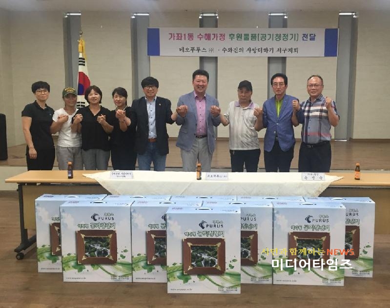 [미디어타임즈=홍기연 기자] 인천 서구 가좌1동은 네오푸루스(대표 김교환)와 수와진의 사랑 더하기 서구지회(서구지회장 전병길)가 수해가정을 위한 후원물품(공기청정기 10대)을 지난 11일 전달했다고 전했다.