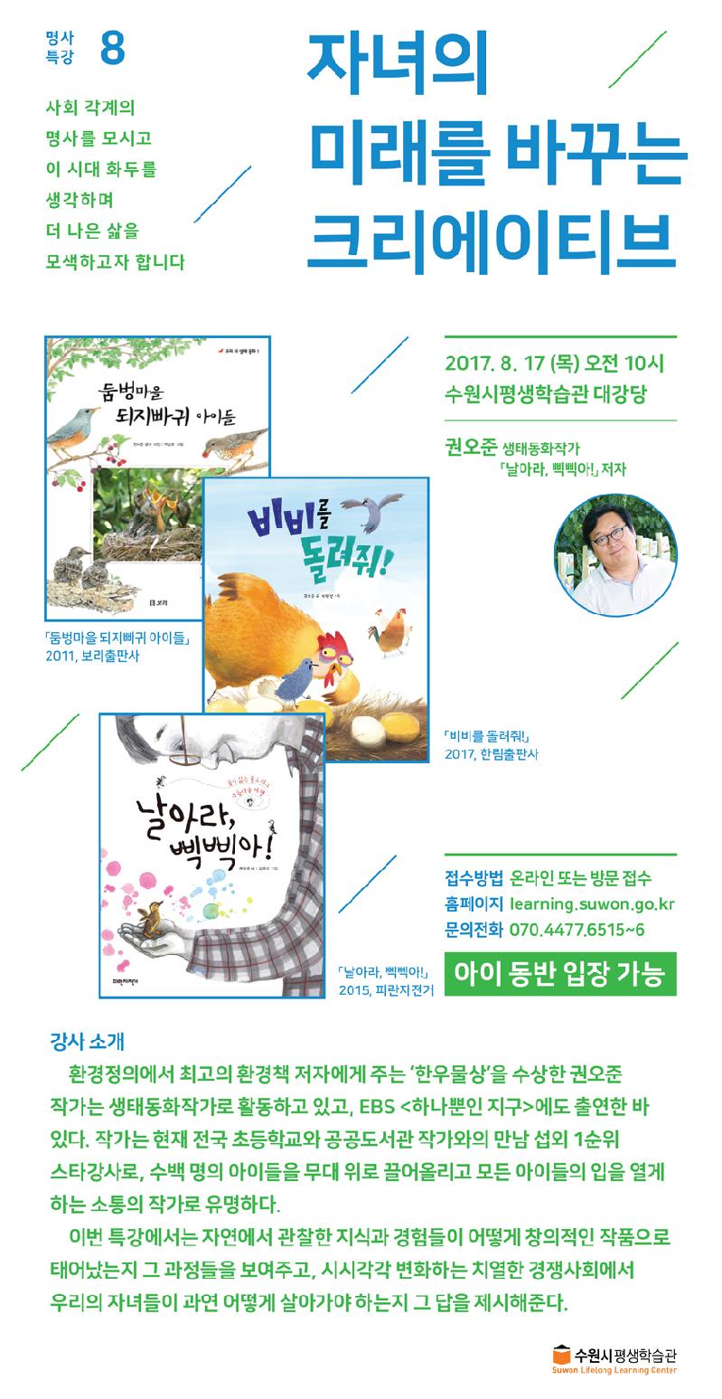 [미디어타임즈= 김창섭 기자] 수원시평생학습관은 오는 17일 오전 10시 팔달구 평생학습관에서 ‘자녀의 미래를 바꾸는 크리에이티브’를 주제로 명사특강을 연다.