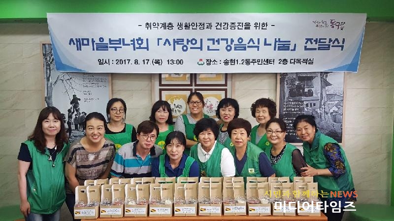 [미디어타임즈=문상수 기자] 인천 동구 송현1․2동 새마을부녀회(회장 김경순)는 17일 관내 독거노인 등 저소득가정 20세대에 여름철 입맛도 살리고 건강도 챙길 수 있는 떡과 과일 을 만들어 전달했다. 이번 나눔 활동은 더위에 지친 저소득 취약계층의 건강증진을 위해 추진됐으며, 부녀회원들이 직접 제작한 재활용비누 판매 및 화도진 축제 수입금으로 떡과 과일을 직접 구입해 정성을 담아 포장해 부녀회원들이 수혜가정에 격려의 말과 함께 직접 전달하여 더욱 뜻 깊었다. 행사를 주관한 김경순 새마을부녀회 회장은 “관내 어르신들께서 정성껏 준비한 떡과 과일을 맛있게 드시고 무더운 여름을 이겨내고 항상 건강하시길 바란다”며,“앞으로도 꾸준히 사랑의 반찬 나눔 활동을 추진할 것”이라고 밝혔다.한편 김상규 송현1․2동 사무장은 재능기부를 통해 진정한 나눔을 실천해준 새마을부녀회원들에게 감사의 인사를 전하며 “고령화 사회를 맞아 소외된 주변 독거 어르신가정에 지속적인 관심과 배려로 따뜻한 정을 나누는 송현1․2동을 만들기 위해 최선을 다할 것”이라고 말했다.
