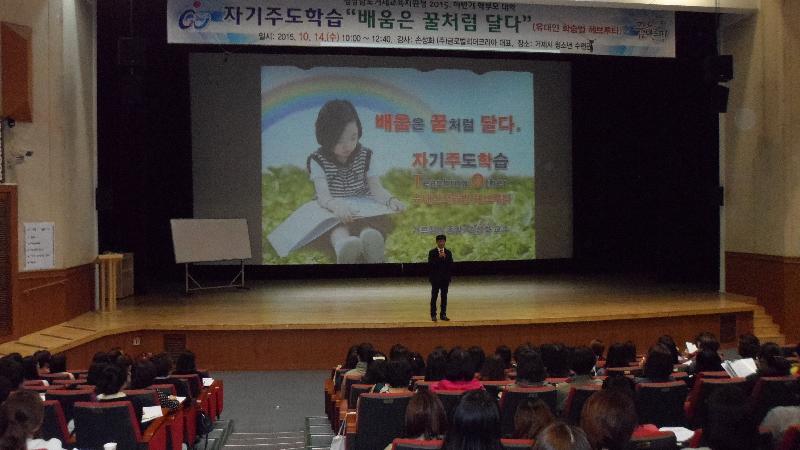 경상남도 거제교육지원청(교육장 김범수)은 지난 14일 오전 거제시청소년수련관 공연장에서 학부모 230여명을 대상으로 “2015. 하반기 학부모 대학”을 운영했다. 이번 학부모 대학은 손성화 ㈜글로벌리더코리아 대표를 초빙해 자기주도학습 “배움은 꿀처럼 달다” 란 주제로 진행되었다.