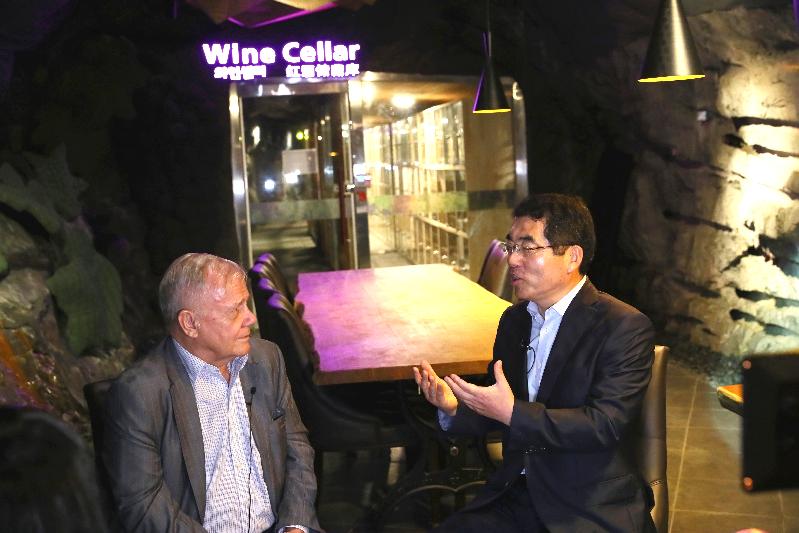 | 지난 1일 광명동굴에서 짐 로저스와 양기대 광명시장이 유라시아 대륙철도와 남북철도 연결의 효과 등에 대해 대담하고 있다. |