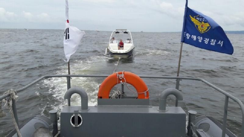 | 기관 고장으로 표류중인 모터 보트 예인중인 포항 해경<미디어 타임즈> |