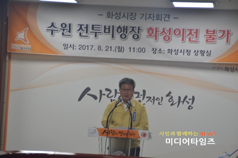 [미디어타임즈= 신훈종 기자] 채인석 화성시장이 21일 오전 11시 시청 상황실에서 긴급 기자회견을 열고 수원 전투비행장 이전을 주장하는 수원시와 수원시 국회의원들의 행태를 규탄했다.