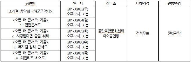 오는 9월 2일부터 7일까지 동탄복합문화센터 야외공연장에서 전석무료로 진행되는 야외공연은 비지정석으로 운영되며, 선착순으로 입장할 수 있다. 공연관련 자세한 정보는 아트홀 홈페이지(art.hcf.or.kr/) 또는 전화 문의(1588-5234)로 확인 가능하다.