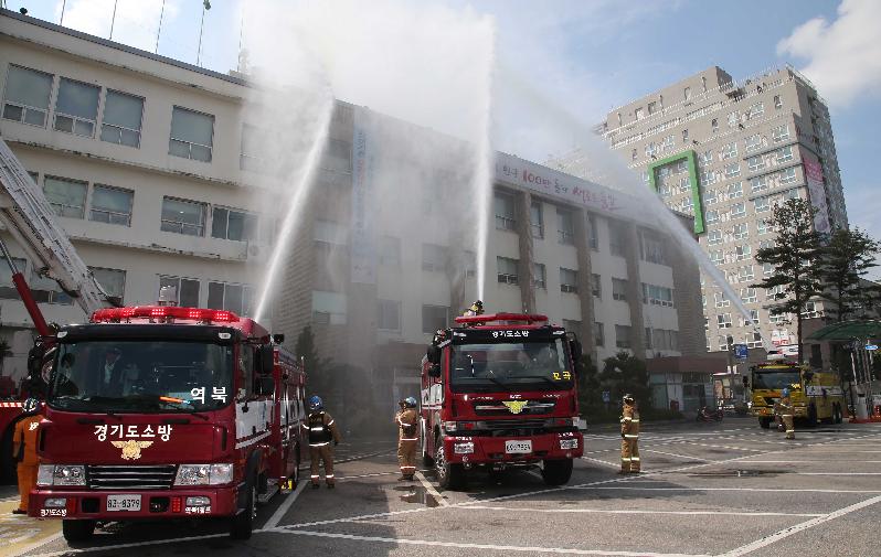화재발생을 가정한 훈련에서 용인소방서 현장대응단은 옥상으로 대피한 부상자를 구조하고, 초기 대형재난 현장에서 환자를 분류하는 방법을 시연했다.