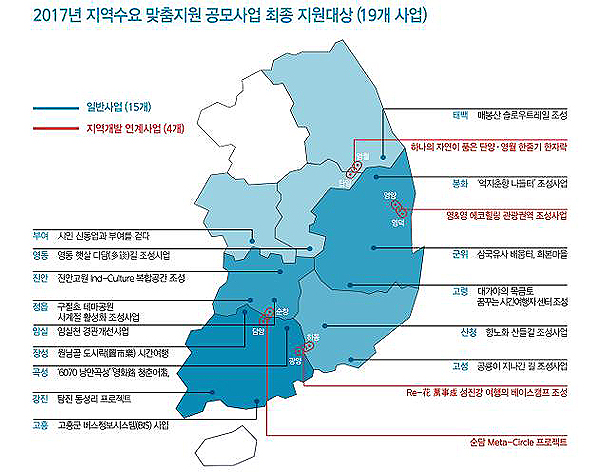 최종 선정사업들은 지역산업, 지역경관, 지역생활복지(BIS 사업 포함), 지역관광·체험 등 총 4개 유형의 사업들로 구성돼 있다.