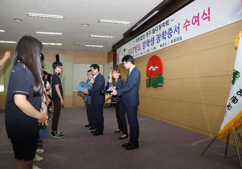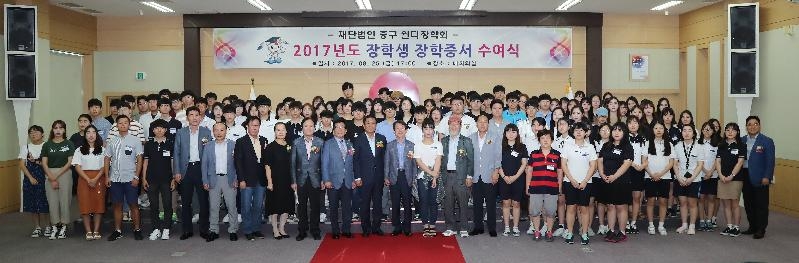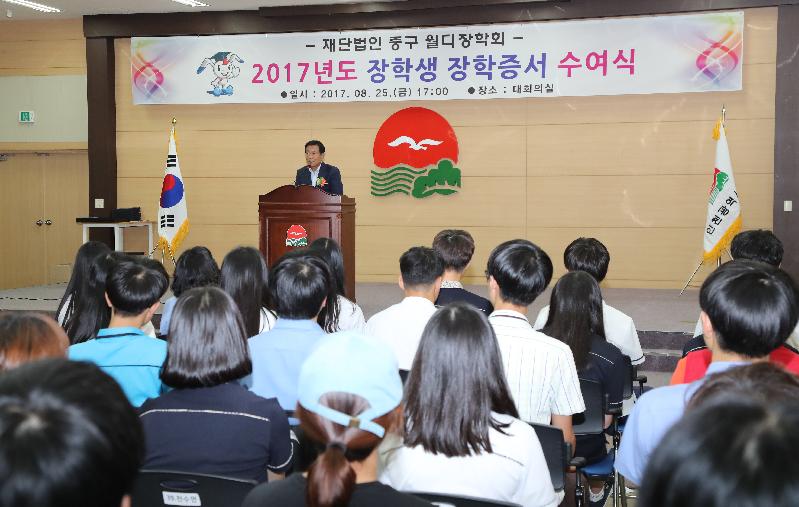 [미디어타임즈=문상수 기자] 재단법인 중구 월디장학회는(중구 신포로 46번길 31 내동 소재) 지난 25일 오후 5시에 중구청 월디관 대회의실에서 「2017년도 장학생 장학증서 수여식」을 개최했다.이날 장학증서 수여식에는 김홍섭 이사장을 비롯한 월디장학회 임원 및 관계자, 장학생 152명 학부모 등 300여명이 참석한 가운데 장학생 152명에게 2억 4,500만원의 장학금을 수여하였다.중구 월디장학회는 지난 2010년 12월 설립 후 그동안 643명의 장학생을 선발해 장학금 11억 2,278만 원의 장학금을 지급한바 있으며, 2017년 장학금 지급을 포함 현재까지 총 10회에 걸쳐 795명의 장학생을 선발해 13억 6,778만 원의 장학금을 지급했다. 한편, 김홍섭 이사장은 인사말을 통해 “지역의 우수 인재들이 중구 구민으로서 자긍심을 가지고 지역사회, 나아가 국가발전에 기여할 수 있는 창의적 글로벌 리더로 성장할 수 있도록 더 많은 지원을 아끼지 않을 것이며, 어려운 환경의 학생들에게는 꿈을 이룰 수 있게 희망의 날개가 되는 디딤돌 역활을 하겠다”라고 밝혔으며, 학부모님들의 자녀 뒷바라지에 대한 노고를 함께 위로했다.중구 월디 장학회 관계자는 “이번 선발을 통해 장학사업의 개선점 등을 심도 있게 분석하여 내년에는 더 많은 학생들에게 장학금이 돌아갈 수 있도록 제도 개선 및 홍보에 노력을 기할 것”이라고 말했다.