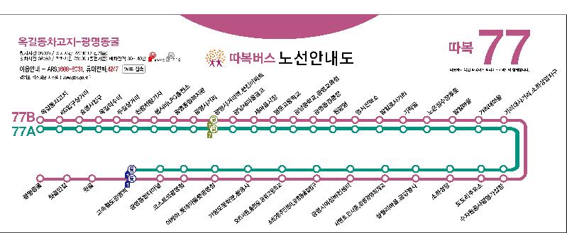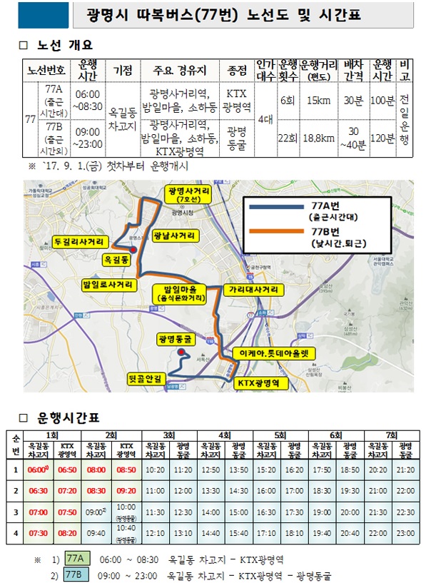 맞춤형 따복버스 77번은 옥길동(두길)-광명사거리역-밤일마을-KTX광명역-광명동굴 노선을 경유하며, 9월1일부터 30분 간격으로 운행된다.