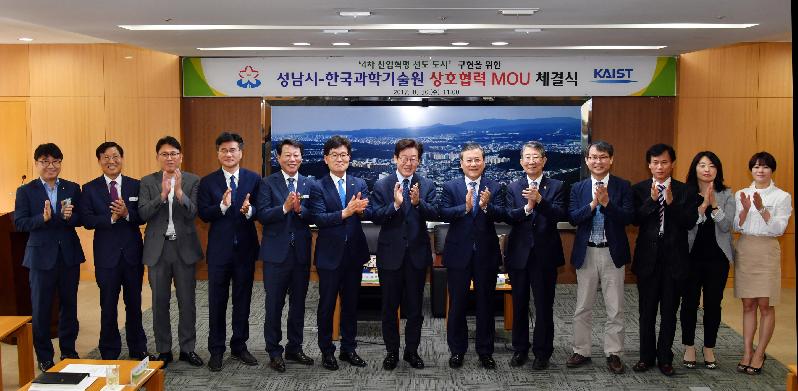 성남시는 30일 오전 11시 시청 9층 상황실에서 이재명 성남시장, 신성철 KAIST 총장, 장병화 성남산업진흥재단 대표이사 등 30여 명이 참석한 가운데 ‘4차 산업혁명 선도 도시 구현을 위한 상호 협력 양해각서 체결식’을 열었다.
