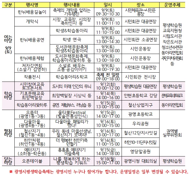 이 외에 축제 첫날인 9월 9일에는 광명시민회관과 시민운동장 일대에서 개막식과 공연, 체험부스 등이 운영되는 ‘여는마당’ 행사가 펼쳐진다. 축제의 개막을 알리는 의미로 광명시민체육관부터 시민운동장까지 약 2km 거리를 가두행진하는 ‘한뉘배움길놀이’도 주목을 끈다.