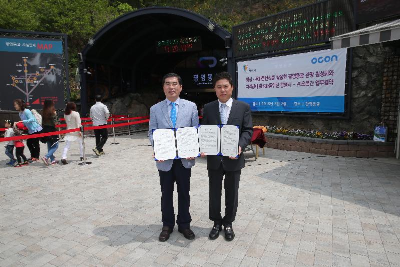 | 2일 광명동굴 입구에서 양기대 광명시장과 김일호 오콘대표가 업무협약식 기념촬영을 하고있다. |