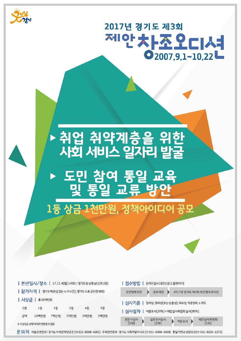 경기도가 실시하는 대국민 정책오디션 ‘제안창조오디션’이 올해 세 번째 대회에 참여할 아이디어 모집에 나선다.