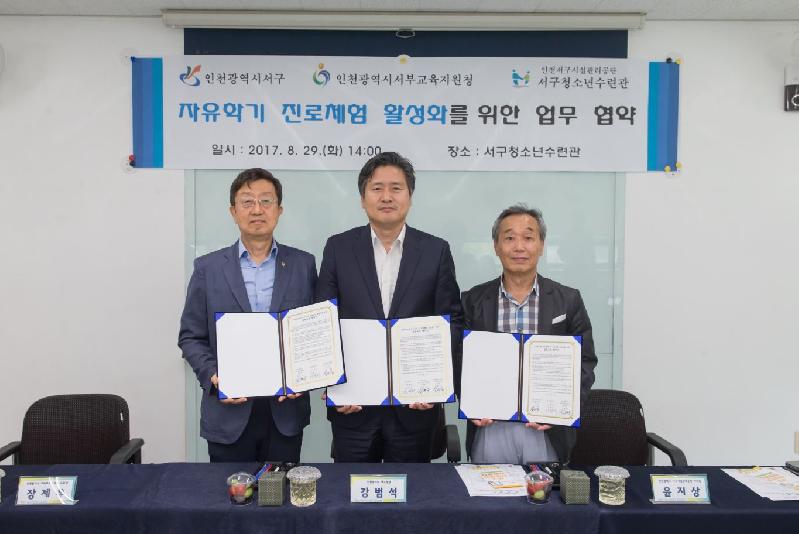 [미디어타임즈=홍기연 기자] 인천시 서구(구청장 강범석)는 지난 29일 서부교육지원청, 서구청소년수련관과 함께 중학교 자유학기제 지원을 위한 업무 협약을 체결했다.
