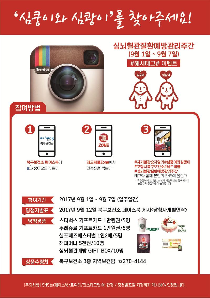 [미디어 타임즈 = 배수남 기자] 9월 첫째 주는 질병관리본부에서 지정한 심뇌혈관질환예방관리주간으로, 국민들에게 심근경색, 뇌졸중과 같은 중증 심뇌혈관질환예방관리 방법을 알리고, 자기혈관 숫자알기라는 슬로건으로 혈압 혈당 콜레스테롤 조기검진을 시행하는 레드써클존을 전국단위로 운영한다. 이에 포항시 북구보건소는 제4회 심뇌혈관질환주간을 맞아, ‘심쿵이와 심쾅이를 찾아주세요!’라는 주제로 SNS 레드써클존 인증샷 이벤트를 실시한다. 레드써클이란, 건강한 혈관을 상징하는 표현으로, 포항시 북구 곳곳에 혈관수치를 측정하고 건강 상담이 가능한 건강부스를 설치하여 레드써클존을 운영하고 있다. 북구보건소는 9월 1일부터 7일까지 죽도시장, 고용복지플러스센터, 포항KTX역, 여성문화회관, 각 주민센터 및 20개소가 넘는 장소에서 레드써클존을 운영하며, 레드써클존에서 인증샷을 찍고 본인 SNS에 자기혈관숫자알기, 심쿵이와심쾅이, 심뇌혈관예방관리주간 등을 해시태그해서 올리는 이벤트를 진행한다. 추첨을 통해 스타벅스, 뚜레쥬르 기프트카드, 해피머니, 오는 9월 22일에서 24일 진행되는 칠포재즈페스티벌 티켓 등 다양한 선물을 지급한다. 북구보건소 관계자는 “고혈압 당뇨병 잠재적 고위험군인 3040세대에게 심뇌혈관질환에 대한 인식과 관심을 유발하고 조기검진 기회확대로 건강검진의 사각지대 해소를 위해 이번 이벤트를 진행한다”며, “심뇌혈관예방관리주간동안 혈압 혈당 체크를 통해 건강도 챙기고, 해시태그 이벤트를 통해 당첨의 행운도 잡기 바란다”고 전했다.