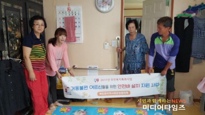 [미디어타임즈=문상수 기자] 북도면지역사회보장협의체(위원장 유관섭, 이하 북도면보장협의체)는 지난 8월 중 거동불편어르신들을 위한 안전바 설치지원 사업을 진행했다.북도면보장협의체는 일상생활의 관절이나 허리굽음 등으로 거동이 어려운 어르신의 불편을 개선하기 위해 지역 특화사업으로 인천보듬이지킴이 공모사업에 참여했다. 해당 사업비로 북도지역(신․시․모도, 장봉도) 거동불편 취약노인 20가구에 화장실 변기 옆, 변기 뒤, 샤워대, 안방 및 거실 벽면 등 어르신들의 주된 이동공간에 지지대 역할의 안전바를 설치했다.이번 사업에 지원을 받은 한 어르신은 “무릎관절이 좋지 않아 텔레비전을 보다가 누가 오면 갑자기 일어나기가 영 힘들었는데, 또 허리가 굽어서 화장실가기가 불편했는데 이 안전바만 잡고 있으면 편하게 바로 일어날 수 있다”며 고마움을 표시했다.한편, 북도면보장협의체는 주거가 취약한 저소득계층 10가구를 추가로 발굴하여 노후된 방충망을 설치하는 사업을 진행할 예정이다.