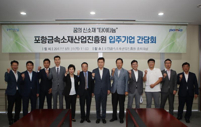 이강덕 포항시장은 31일 포항금속소재산업진흥원(POMIA)에 올해 7월 신규 입주한 ㈜제엔케이 등 타이타늄 관련기업 5개사 대표와 임원 20여명이 참석한 가운데 기업애로사항과 향후 미래청사진에 대한 소통의 장을 가졌다. POMIA에 입주한 5개 기업(㈜엠티아이지, ㈜제앤케이, ㈜유엘, ㈜티엔텍, ㈜S&W IND)은 본사 혹은 연구소를 포항으로 이전하여 다양한 분야의 타이타늄 사업을 본격적으로 추진하기 위한 발판을 마련하고 있다. 타이타늄은 21세기형 첨단산업에 어울리는 금속소재로서, 기존 철강소재를 월등히 뛰어넘는 고강도 경량성, 인체 무해성, 강력한 내식성 등의 특성을 가져 각종 고부가가치 생산품에 필수적인 원소재로서 손꼽힌다. 이날 간담회에서 타이타늄 기업 관계자들은 시장형성을 위한 활로개척 및 중소기업의 기술역량을 강화할 수 있는 지속적인 지원을 요구했다. 특히, 블루밸리 산단 내 입주계획이 있는 ㈜엠티아이지 박영석 대표는 지난해 6월에 MOU를 체결하고 입주계획을 서두르고 있지만, 경기 악화 등으로 어려움이 있어 기업에 대한 자금지원이나 산단 분양가에 대한 혜택을 요청했다. 이에 포항시는 다음달 20일부터 사흘간 블루밸리 국가산단 내 부지에 대하여 분양가 할인 등을 통해 타이타늄기업의 입주를 독려하고, 입주 후 벤처자금 지원을 통해 산단 내 자리 잡을 수 있도록 적극적인 행정지원을 아끼지 않겠다고 했다. 포미아에서는 기업에서 기구축된 시험평가 인증장비를 활용할 수 있도록 장비를 항시 개방하고 금속소재, 기계공학 등 총66명으로 구성되는 산학연관 전문가로 구성된 포미아 전문기술협의회를 구성하여 전문분야별 중소기업의 후원자로서 든든한 버팀목이 될 것을 약속했다. 이강덕 포항시장은 “포항 블루밸리 국가산업단지에 타이타늄 기업들이 상생하며 성장할 수 있는 집적화를 이룰 수 있도록 다방면의 아낌없는 지원하겠다”며, “POMIA 및 신규 입주기업들도 지역 일자리 창출 등 지역경제의 큰 몫을 해주기 바란다”고 당부했다. 한편, 포항시는 지난해 8월 POSCO-경상북도-포항시 간 타이타늄 산업 육성 양해각서를 체결했으며, 포항산업과학연구원(RIST)이 첨단산업 전략소재·부품 시험인증 기반구축 사업을 추진하고 있다. 또, POMIA의 타이타늄 첨단소재기업 육성사업(2년간 30억원)을 통해서는 철강중심 산업구조를 고부가가치 첨단소재 산업으로 전환시키기 위해 노력하고 있다.