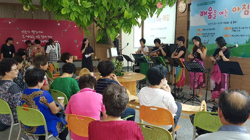 현관 로비에서 진행된 이날 행사는 강사, 학습자, 공연진들과 함께 차와 다과를 하면서 ‘러닝브릿지’, ‘상상대학’, ‘학습동아리’ 에서 그동안 갈고 닦은 실력을 뽐내며 우리 귀에 친숙한 음악 공연으로 아침을 열었다.