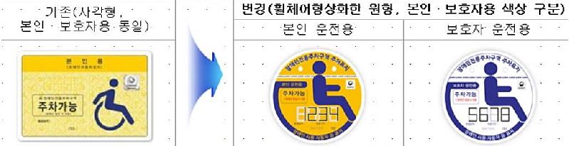 새로운 장애인자동차 주차가능 표지는 원형이고, 노란색(본인 운전용)과 흰색(보호자 운전용)으로 색이 구분된다.
