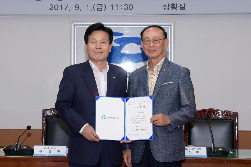 | 1일 오전 여수시청 상황실에서 주철현 여수시장(왼쪽)이 서두현 MG새마을금고 여수시협의회장으로부터 지역희망공헌사업비 기탁증서를 받고 있다. |