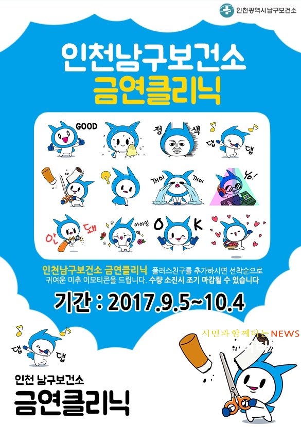[미디어타임즈=문상수 기자] 인천 남구(구청장 박우섭)가 카카오톡 이모티콘 ‘미추’를 무료로 배포한다.남구 캐릭터인 미추는 이모티콘 12종으로 제작, 5일 오전 11시 카카오톡을 통해 선착순 3만명에게 무료로 배포될 예정이다.미추 이모티콘은 카카오톡 플러스 친구 찾기에서 ‘인천남구보건소 금연클리닉’을 검색한 후 남구보건소 금연클리닉과 카카오톡 플러스친구를 맺고 내려받을 수 있다.내려받은 이모티콘은 한 달 간 무료로 사용할 수 있다.한편 남구보건소 금연클리닉에서는 카카오톡 플러스 친구를 통해 평일 오전 9시부터 오후 6시까지 금연과 관련된 궁금증을 금연상담사와 실시간 1대1 대화로 해결해 주고 있다.또 금연상담을 비롯해 니코틴중독검사, 흡연의 폐해, 금연에 도움이 되는 지식, 절주 등 건강생활실천을 위한 다양한 정보도 제공하고 있다.남구보건소 관계자는 “흡연율 감소를 위한 다양한 금연사업을 실천하고 있다”며 “앞으로도 SNS 활용한 정보제공을 보건소 사업 전체로 확대 운영해 주민 건강증진을 위해 최선을 다하겠다”고 말했다.