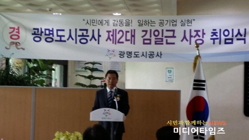 | 4일 오전 광명도시공사 제2대 김일근 사장이 취임인사를 하고 있다. (사진=저작권자 ⓒ미디어타임즈) |