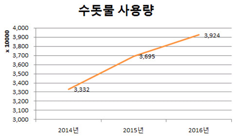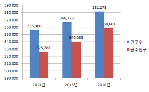 같은 기간 인구는 355,900명에서 381,278명으로 7.1% 증가하고 급수인구는 325,788명에서 358,601명으로 10.1% 늘어났다. 이에 따라 연간 수돗물 사용량도 3,332만톤에서 3,924만톤으로 17.8%가 증가하며 급수수익과 급수공사 매출액도 각각 19.6%, 48.7%가 증가했다.