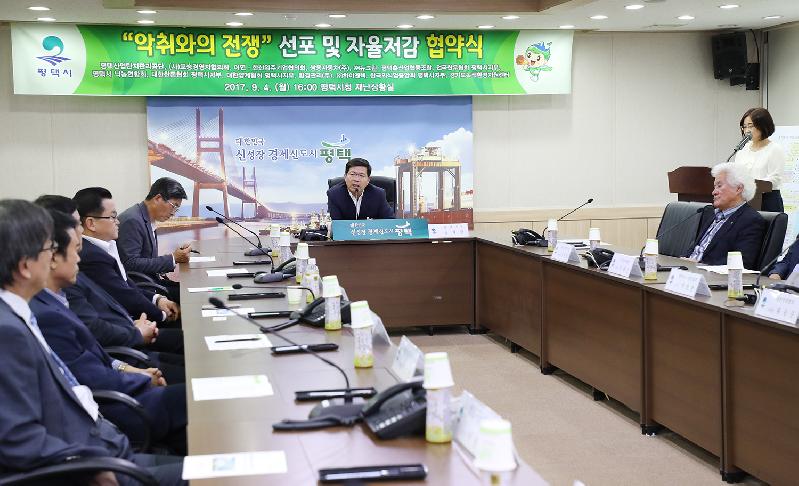 [미디어타임즈= 이옥수 기자] 평택시(시장 공재광)는 지난 4일 평택시청 재난상황실에서 사람살기 좋은 평택시 조성을 위해 공장, 축사, 공공하수처리시설 등 기업대표 및 관련단체, 시민, 언론인 등 40여명이 참석한 가운데 악취와의 전쟁을 대대적으로 선포하고 평택산업단지관리공단, 평택축산업협동조합, 쌍용자동차(주) 등 13개 단체, 기업과 악취자율저감협약을 체결했다.