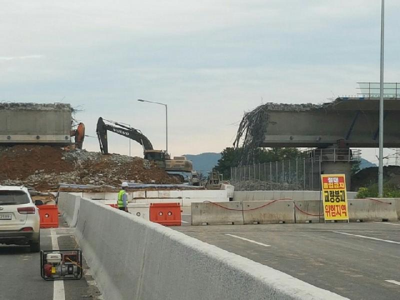 교량상판 및 교각 철거(해체) 공사는 현재 국도43호선 위에 임시 성토를 완료하고 사고 교량의 상판과 날개부를 철거하는 공법으로, 5일 현재 상판 날개부 철거와 상판 본체 절단을 완료하고, 구조물 철거작업이 진행되고 있다.