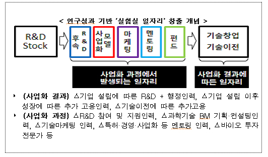 ‘연구성과 기반 실험실 일자리’란 정부 R&D 성과물의 기술이전·창업 등 사업화를 통해 창출된 일자리 뿐 아니라, 후속R&D, 사업화모델 마련 등 기술사업화 수행과정에서 발생되는 일자리까지 포함하는 개념이다.