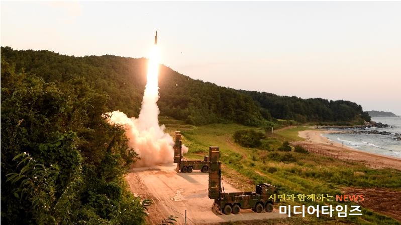 | 4일 새벽 동해안에서 육군의 지대지 탄도미사일인 현무를 발사하고 있다. (사진=합동참모본부 제공) |