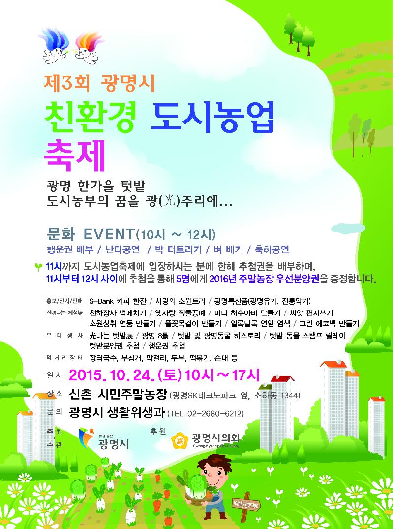 광명시는 생명과 환경을 살리는 ‘제3회 광명시 친환경 도시농업 축제’를 10월 24일 오전 10시부터 오후 5시까지 신촌 시민주말농장(광명SK테크노파크 옆, 소하동 1344)에서 개최한다.