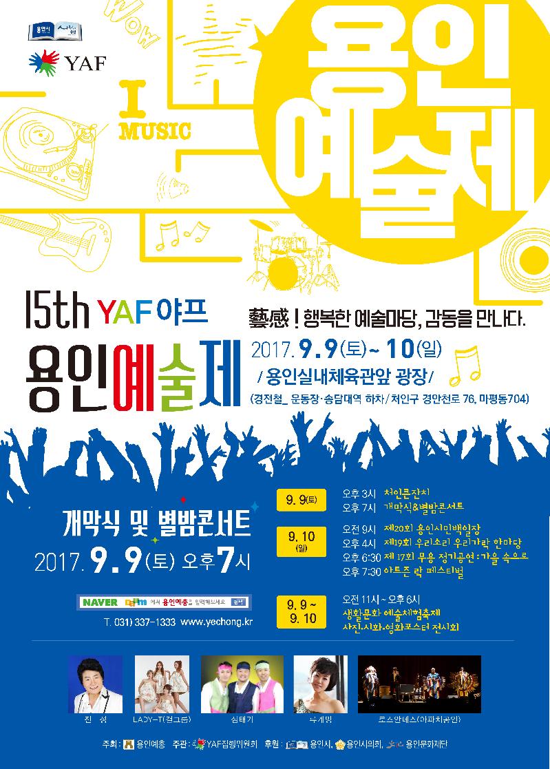 용인시는 오는 9~10일 처인구 마평동 실내체육관에서 용인예총 주최로 다양한 공연‧전시‧경연행사가 열리는 ‘제15회 용인예술제(YAF)’를 개최한다고 밝혔다.