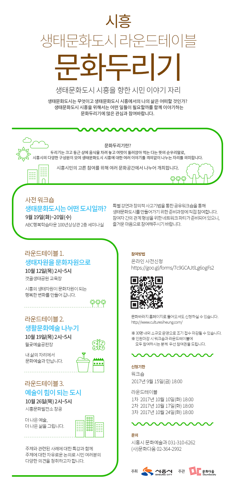 이번 행사의 부제인 ‘문화두리기’의 ‘두리기’는 크고 둥근 상에 음식을 차려 놓고 여럿이 둘러앉아 먹는 다는 뜻의 순우리말로, 시흥시의 다양한 구성원이 모여 생태문화도시 시흥에 대해 격의 없이 이야기를 나누는 자리를 의미한다. 행사의 의미만큼 진행자와 참여자 간의 문화적 연대를 만들어 가는 자리가 되도록 진행할 예정이다.