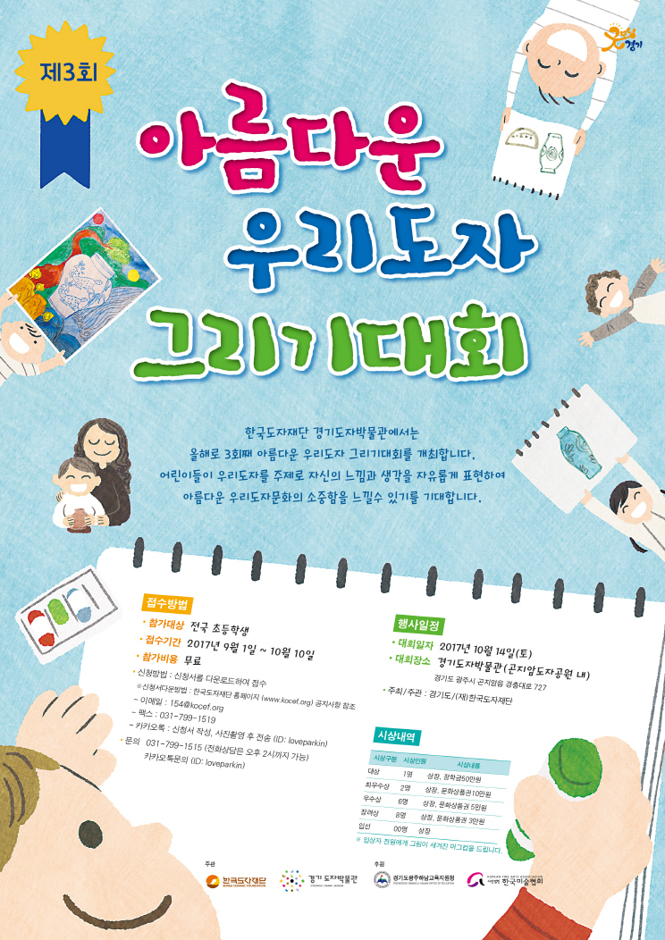 경기도자박물관에 전시된 우리 도자기를 감상하고 이를 주제로 그리면 되는데 크레파스, 수채화, 연필화 등 표현방법에는 제한이 없고, 도화지는 현장에서 제공돼 참여 학생은 그림도구만 지참하면 된다.