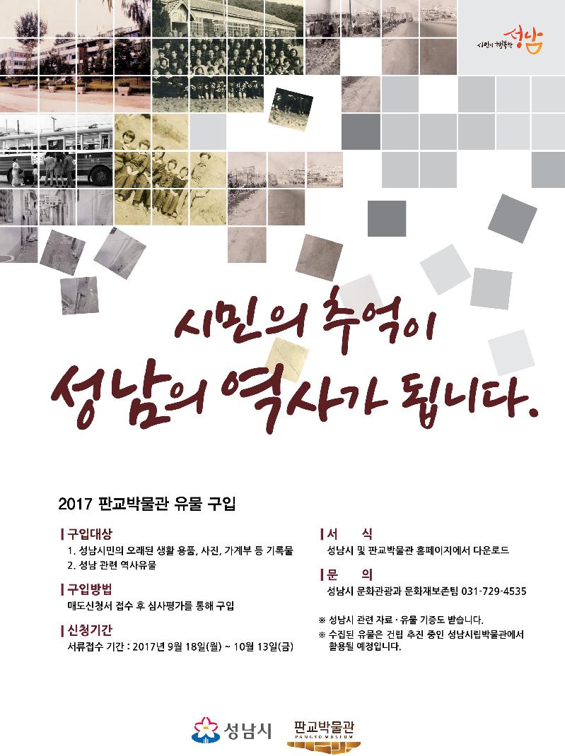 고향이 성남이거나 오래 거주한 시민이 갖고 있는 추억의 옛날 사진, 앨범, 가계부, 일기장 등 개인 기록물과 마을공동체, 지역의 역사와 관련된 옛 물건이 수집 대상이다.