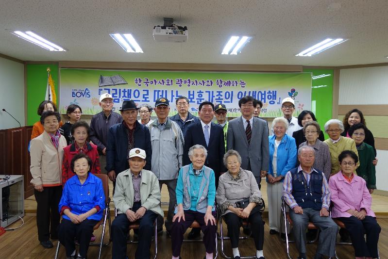| 기부금 후원 전달식 및 그림책으로 떠나는 보훈가족의 인생여행 프로그램을 마치고 참석자 전원이 기념 촬영을 하고있다. |